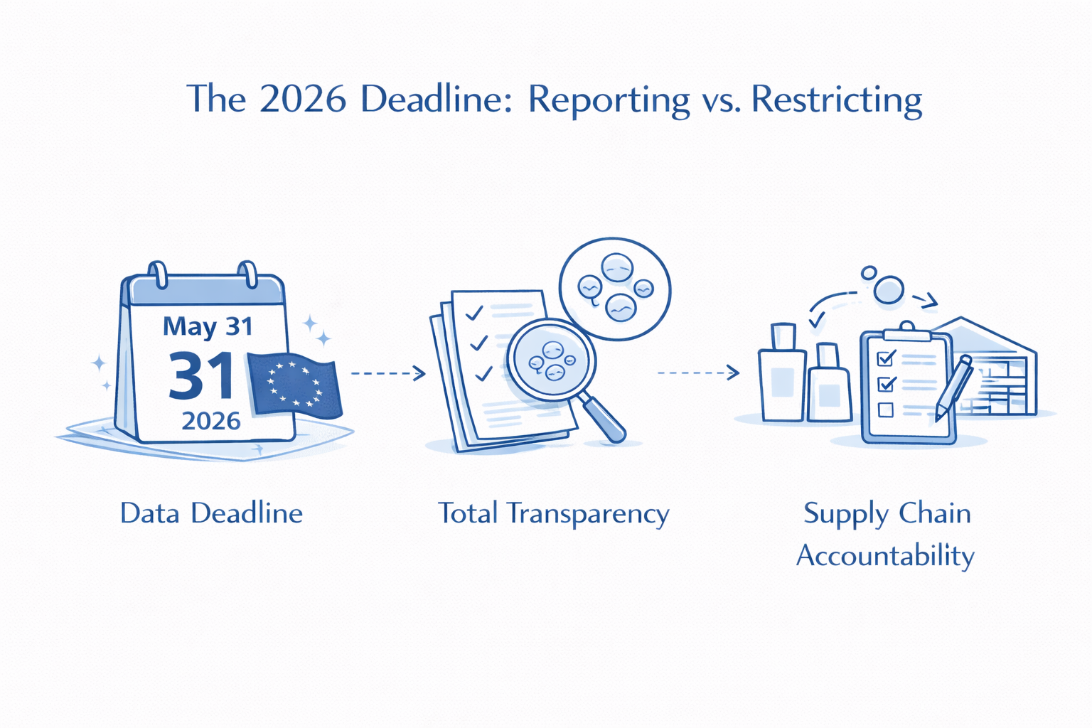 특정 제품 카테고리에 대한 전면 금지는 몇 년에 걸쳐 시행되지만 즉각적인 압박 포인트는 2026년 5월 31일. 이것이 “데이터 데드라인”입니다.이날부터 EU 시장에 상품을 출시하는 모든 브랜드는 다음과 같은 엄격한 문서를 제공해야 합니다. 합성 고분자 미립자 (SPM).